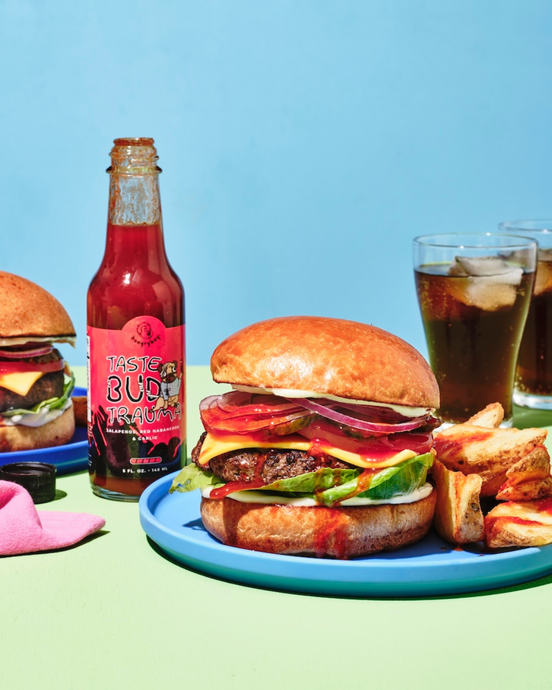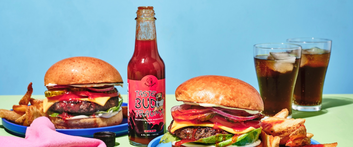 So you want to be traumatized? We’re not joking with this blood red concoction from the depths of Juicy’s brain (a scary, scary place). Made with three types of peppers (because one wasn’t enough) you’ll enjoy a hit of sweetness with a whole side of burning heat. If you love your food hot just go right ahead and pour Taste Bud Trauma over everything.